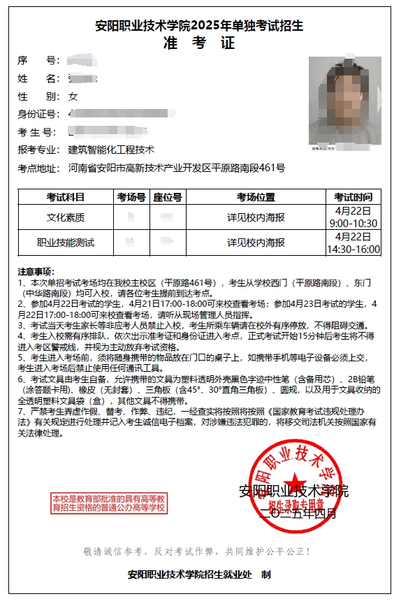 1、本次单招考试考场均在我校主校区(平原路461号),考生从学校西门(平原路南段)、东门(中华路 南段)均可入校,请各位考生提前到达考点。