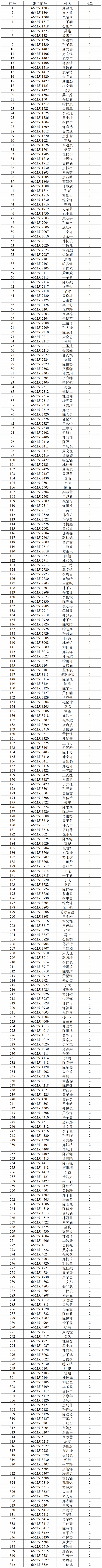 经我校“三位一体”招生综合评价笔试,按各招生类别招生计划数 1:4 比例,成绩从高到低排序(末位成绩出现并列者同时获得面试资格),以下考生获得面试资格。请入围面试考生于明天(4月20日)按照规定时间,至温州医科大学茶山校区同济楼(6号楼)一楼大厅报到并参加面试。考生迟到超过规定的综合测试面试报到时间15分钟以上,视为弃考。