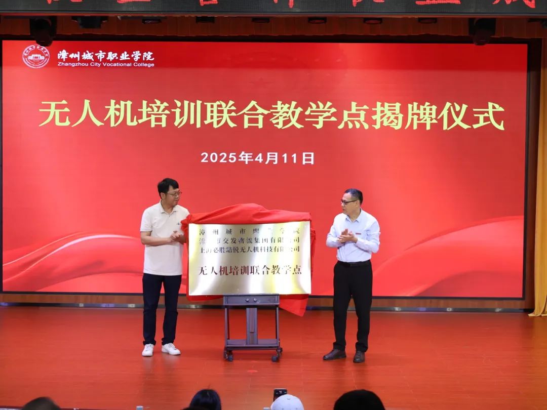 高浩、漳城院数字智能学院院长王松河为“无人机培训联合教学点”揭牌。
