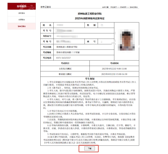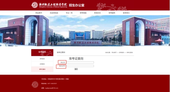 打开网页(https://www.zzure.edu.cn/zsb/bkfw/zkzcx.htm)进入郑州轨道工程职业学院准考证查询页面