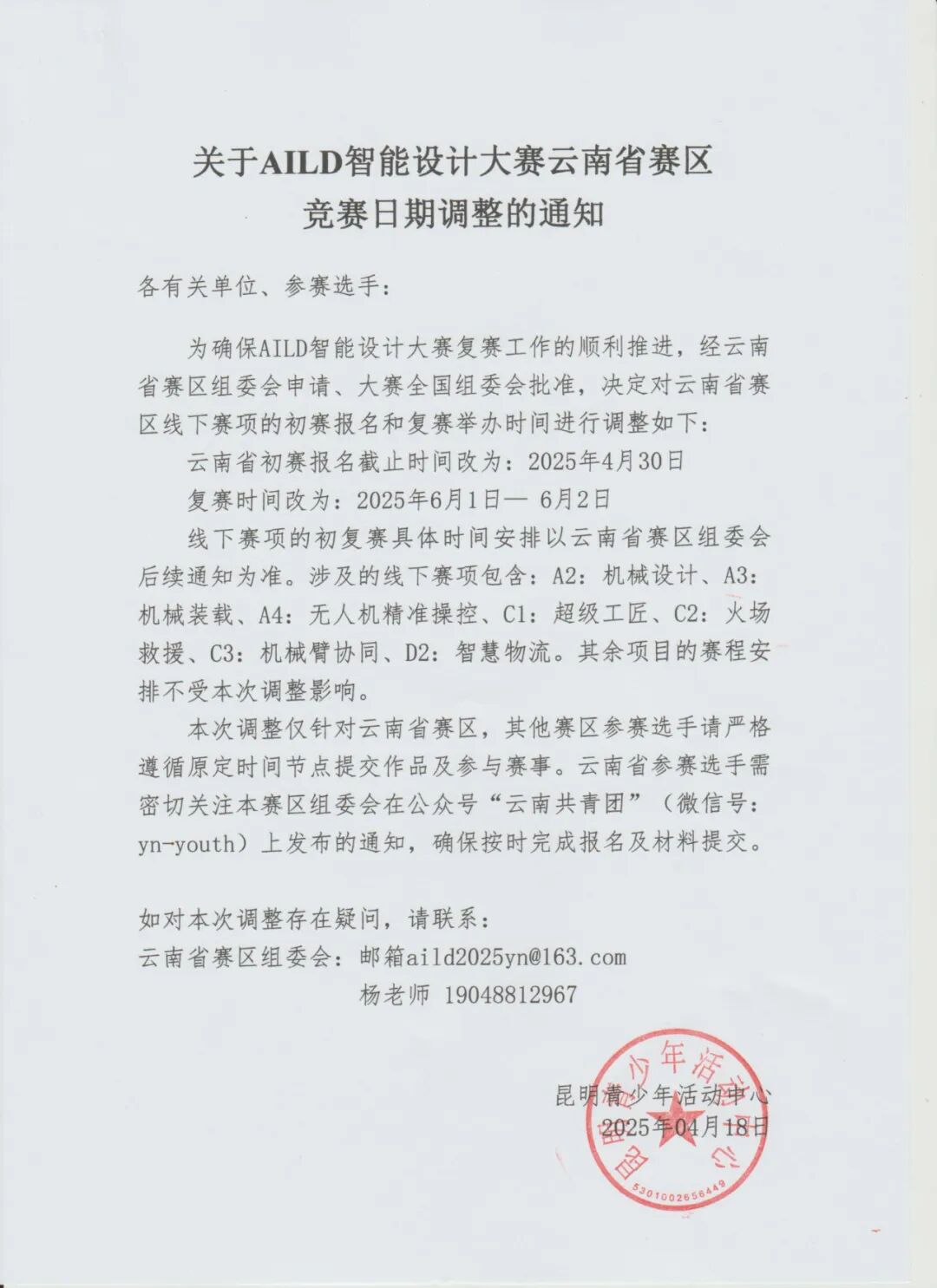 为确保AILD智能设计大赛云南省复赛工作的顺利推进,经云南省赛区组委会申请、大赛全国组委会批准,云南省初复赛部分赛项的日期安排有所调整。现将调整通知转发如下,请云南省各参赛单位、指导教师和选手知悉并做好相应准备。