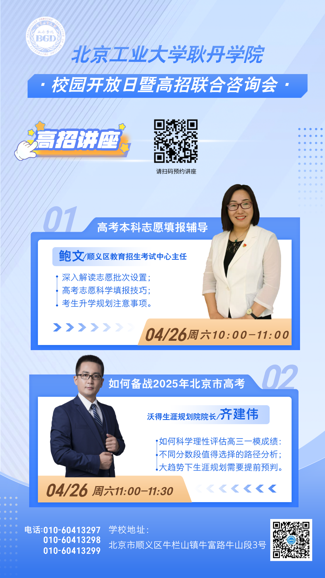 4月26日北京工业大学耿丹学院开放日暨高招联合咨询会在这里,您将听到专业的解读感受到温暖的支持让我们在这个春日不见不散,一起向未来!