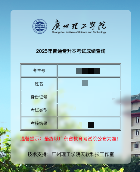 专业能力考核结果已公布于广州理工学院招生网,考生可凭身份证号和考生号进行查询。