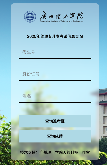 第一步,进入广州理工学院招生网,打开栏目“普通专升本”,点击“准考证打印”进入查询页面。