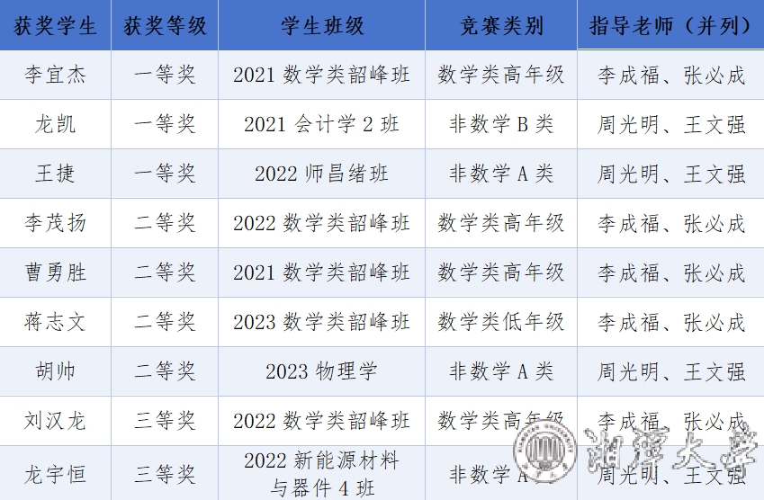 湖南赛区共选拔了32名选手参赛,我校有9名学子入围全国决赛,其中5名数学类选手均来自数学类韶峰班,4名非数学类选手来自材料科学与工程学院、物理与光电工程学院、商学院。