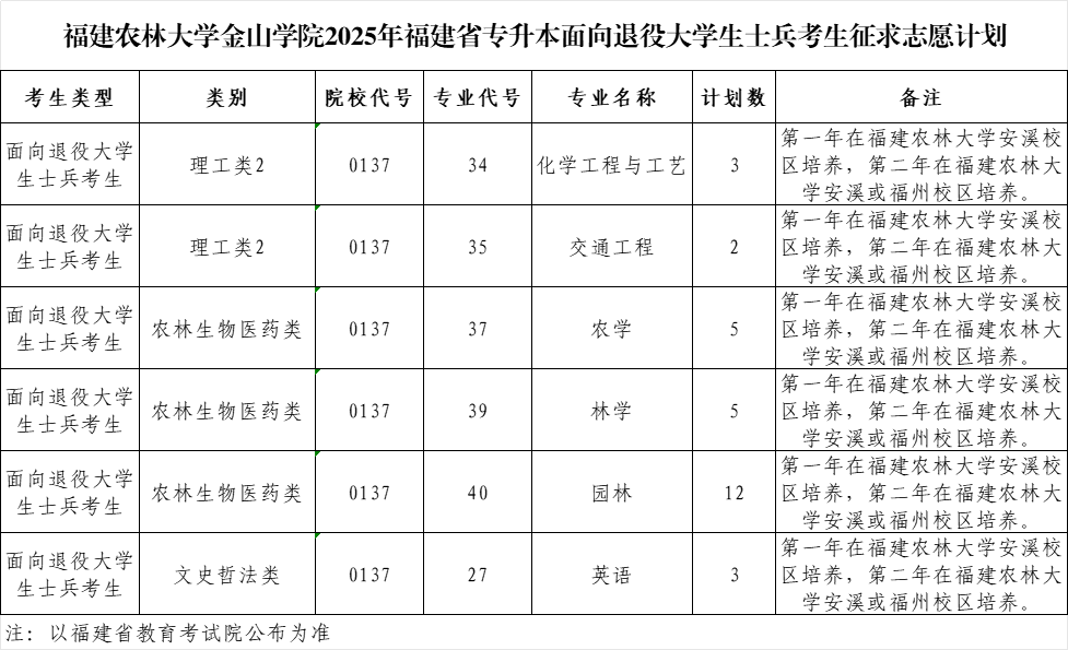 我院2025年福建省专升本面向退役大学生士兵考生常规志愿投档结束,有缺额计划须进行征求志愿,具体专业和计划如下(具体以福建省教育考试院公布的为准)。