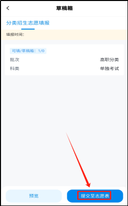 考生确认所填写志愿草稿准确无误后,须点击【草稿箱】→【提交至志愿表】,输入登录密码进行确认,确保提交成功后志愿方可生效。