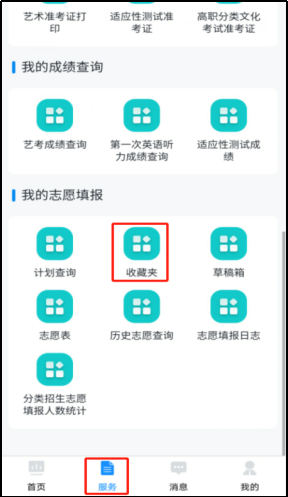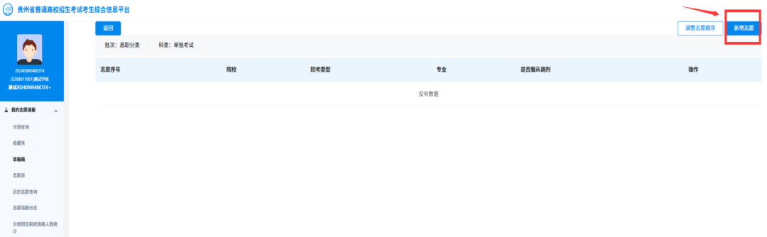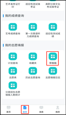 方式2:通过【服务】→【我的志愿填报】→【草稿箱】进入草稿箱页面,依次点击【可填/草稿箱】栏→【+新增志愿】按钮,选择相应的院校专业添加到草稿箱。