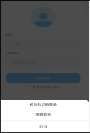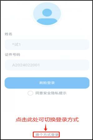 系统默认登录方式为【刷脸登录】,考生可点击下方【换个方式登录】,选择【短信验证码登录】或【密码登录】。