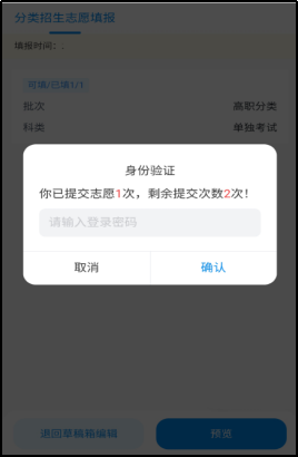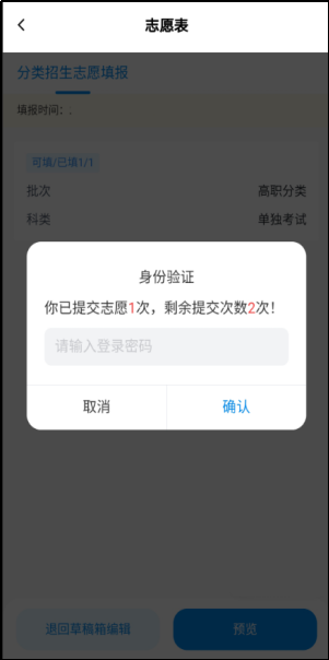 考生如需修改已提交志愿,可通过【志愿表】→【退回草稿编辑】,将已提交志愿退回至草稿箱,此时系统会提示已提交志愿表次数和剩余可提交次数。