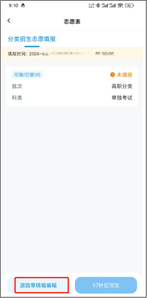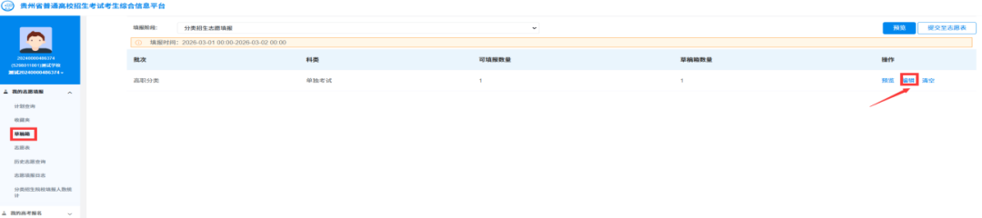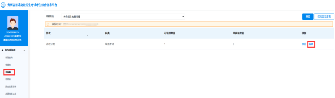 已提交志愿退回至草稿箱后,可在【草稿箱】中对志愿再次进行编辑,编辑结束后须再次进行提交。考生在志愿填报期间,最多可提交3次志愿,在填报时间截止后,所填报志愿不能进行任何修改。