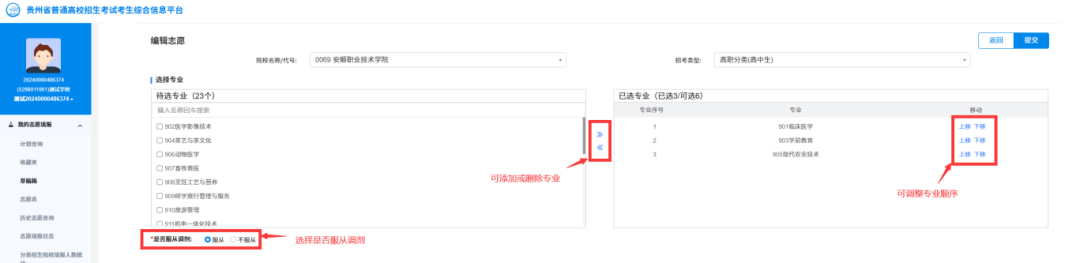 通过【草稿箱】→【编辑】功能,可编辑志愿草稿,进行专业顺序调整和确认是否服从调剂,点击“提交”完成编辑。
