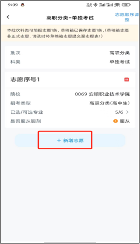 如草稿箱中已存在1个院校志愿,则不能添加其它院校志愿。如需添加其它院校志愿,可通过【服务】→【草稿箱】进入到志愿草稿页面,点击可删除草稿志愿。