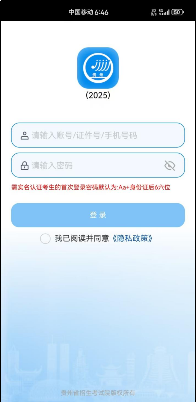 2.登录APP考生在手机上打开【贵州招考】APP,输入本人考生号或证件号或手机号,选择【我已阅读并同意《隐私政策》】,点击下一步。