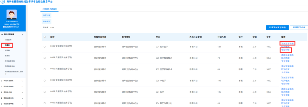 方式1:从收藏夹中添加志愿草稿。通过系统左侧的【我的志愿填报】→【收藏夹】→【专业详情】功能,可查看各院校专业详情(特别注意限制性条件),通过系统左侧的【我的志愿填报】→【收藏夹】→【添加至草稿箱】可以将收藏夹中的院校专业添加至草稿箱。