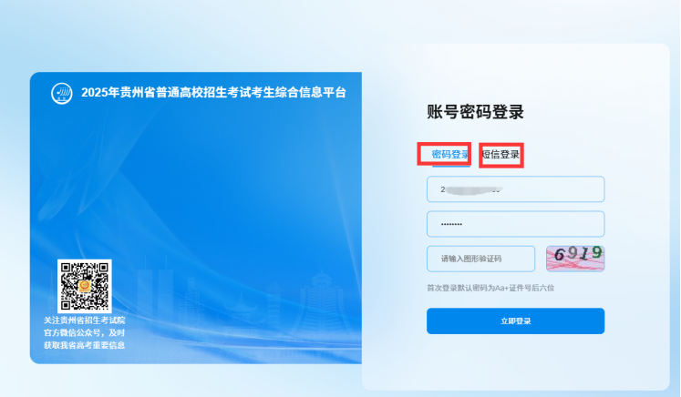 通过电脑浏览器访问贵州省普通高校招生考试考生综合信息平台http://gkks.eaagz.org.cn,进入登录首页。如下图所示:输入考生号/证件号,在登录页面中选择“密码登录”或“短信登录”。