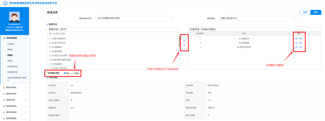 (二)凡参加高职分类考试招生报名,符合报考资格的“高中类”、“中职类”(不含五年一贯制和三三分段制) 、“专项类”考生须登录贵州省招生考试院网站,根据“资料下载”栏目公布的《贵州省2025年高职院校分类考试招生专业目录》进行志愿填报。考生未按填报说明和招生章程要求填报导致志愿无效的后果自负。