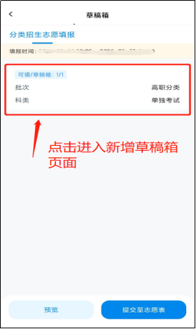 在草稿箱中添加志愿后,考生可通过【草稿箱】→【预览】功能,查看自己的“考生志愿草稿表”。