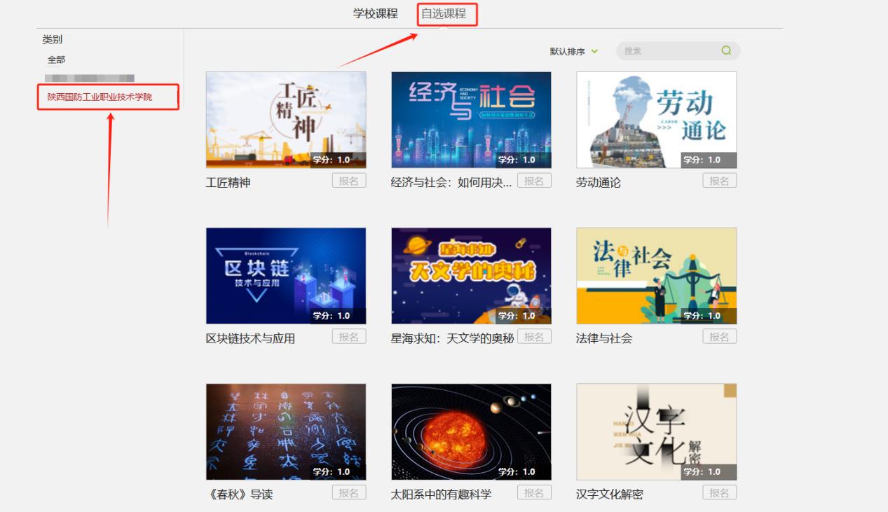 4.进入选课页面后,在【自选课程】模块下,选课【陕西国防工业职业技术学院】,在该页面下选择课程进行报名。