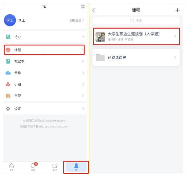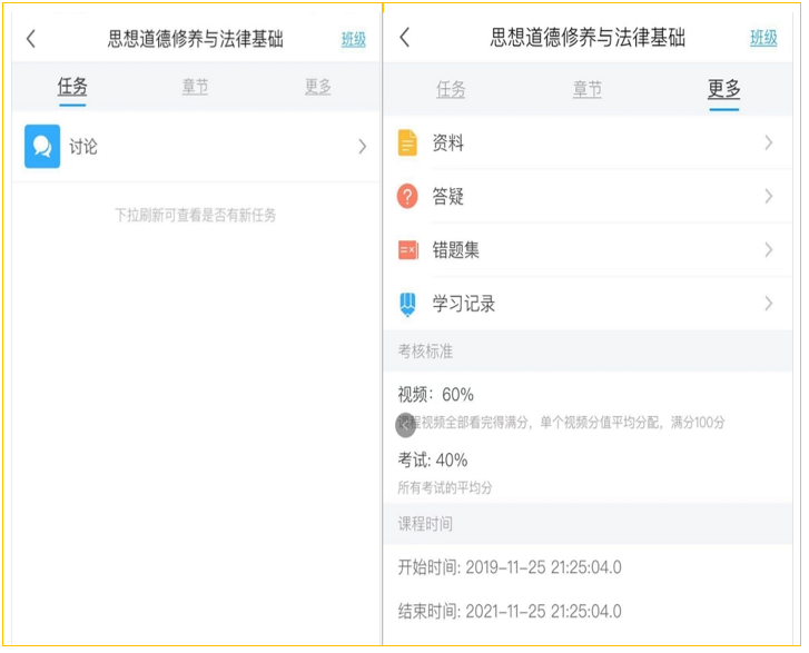 5.点击课程页面的【任务】及时查看到课程的通知,【更多】查看到该课程考核的比例,及自己课程的学习进度。