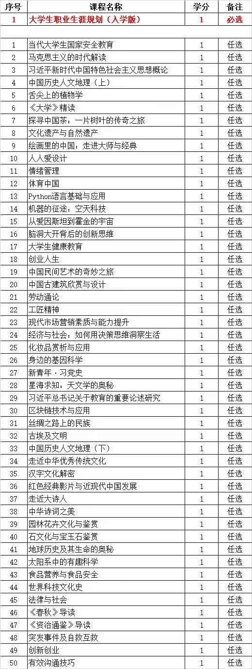 每名学生需完成2门课程的学习,其中《大学生职业生涯规划(入学版)》为必选课,其余课程学生可根据个人实际需求从余下的50门课程中任意选择进行学习。所选课程经学习、考试成绩合格后获得相应学分,考试由平台在线上举行。