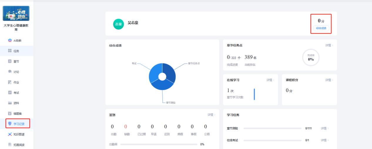 6.依次完成章节视频学习、章节测验后,可在【学习记录】页面下查看到该课程考核的比例,及自己课程的学习进度。