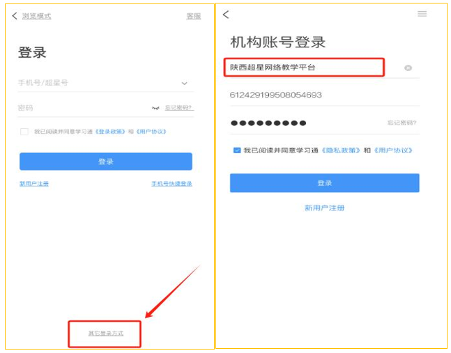 1.下载学习通,下载完成后,点击登录,选择最下方“其它登录方式”,输入代码:24545,勾选“陕西超星网络教学平台”,依次输入身份证号、密码进行登录。(密码为:sgf+身份证号后6位,例如:sgf054693、sgf05363X,最后一个字母X大写)