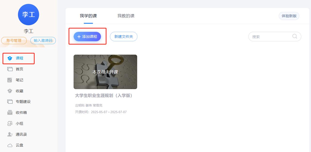 3.登陆后点击“课程”板块,然后点击“添加课程”进入选课页面。