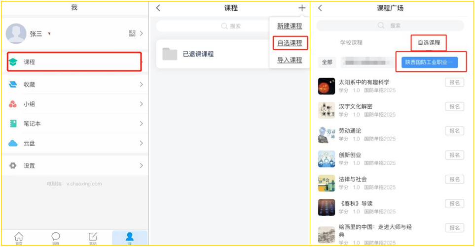 2.登录后点课程,即可进入所学课程,点击右上角“+”,点击【自选课程】进入课程广场,选择自选课程下【陕西国防工业职业技术学院】选择课程点击【报名】即可,如图: