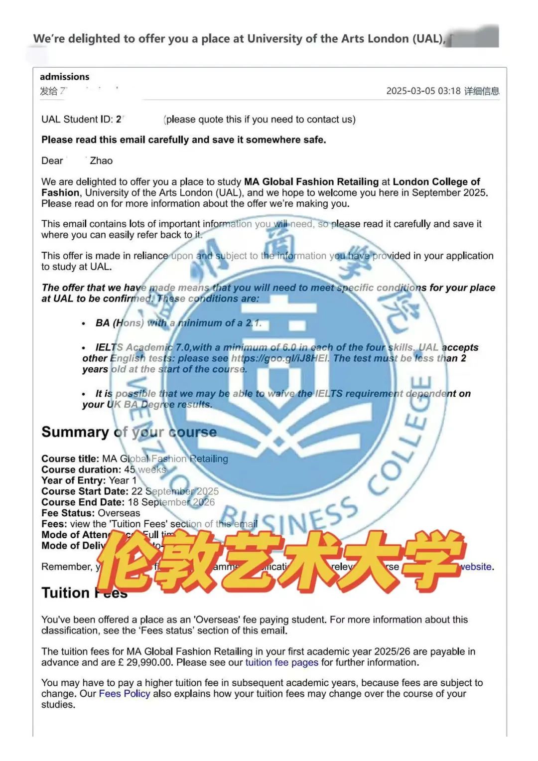 录取梦校伦敦艺术大学