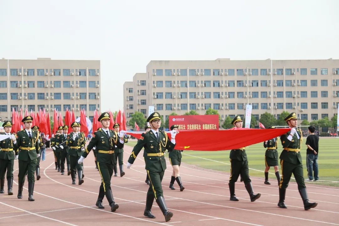 入场仪式完毕,全场起立。升中华人民共和国国旗、西安石油大学校旗、运动会会旗,全场师生齐唱国歌、校歌。