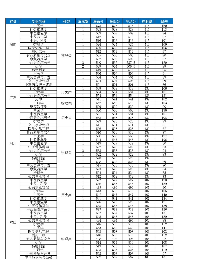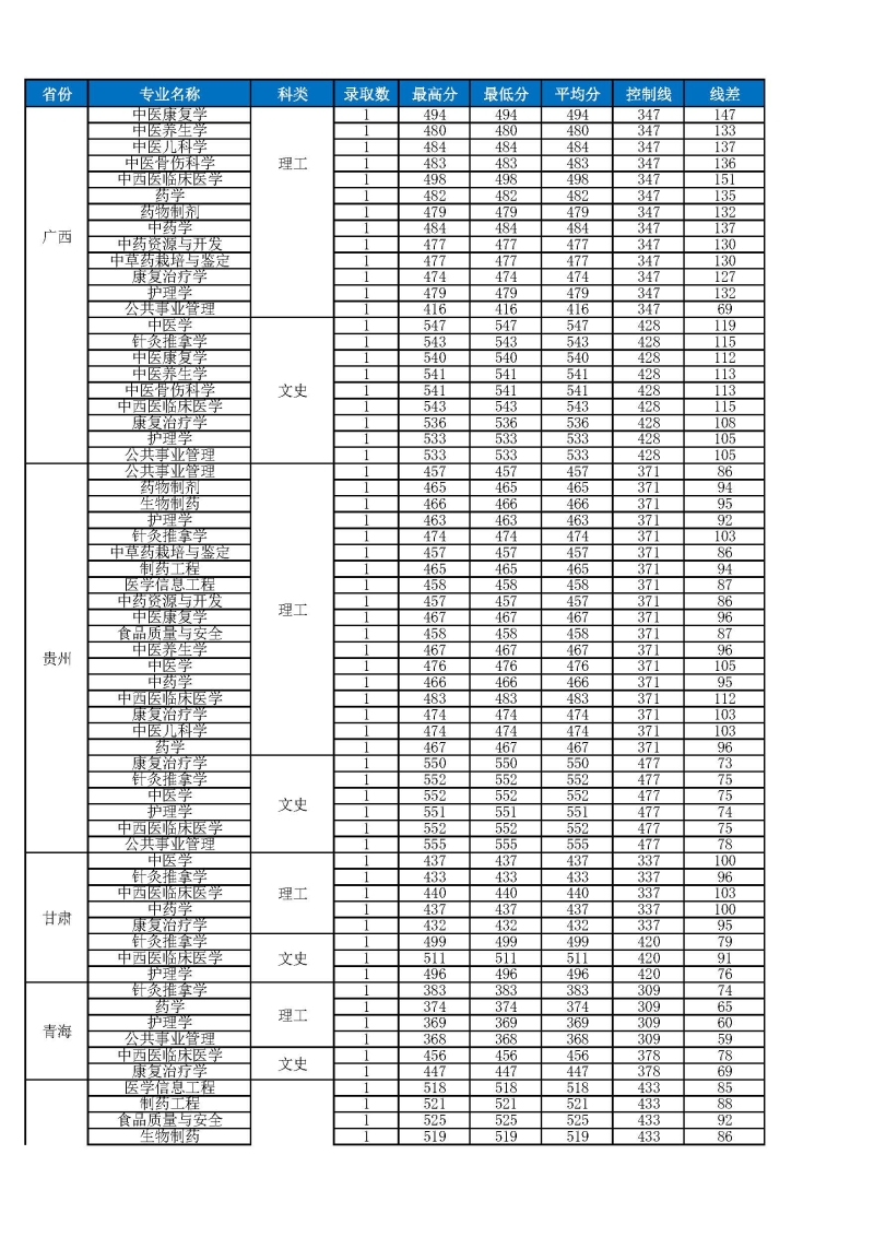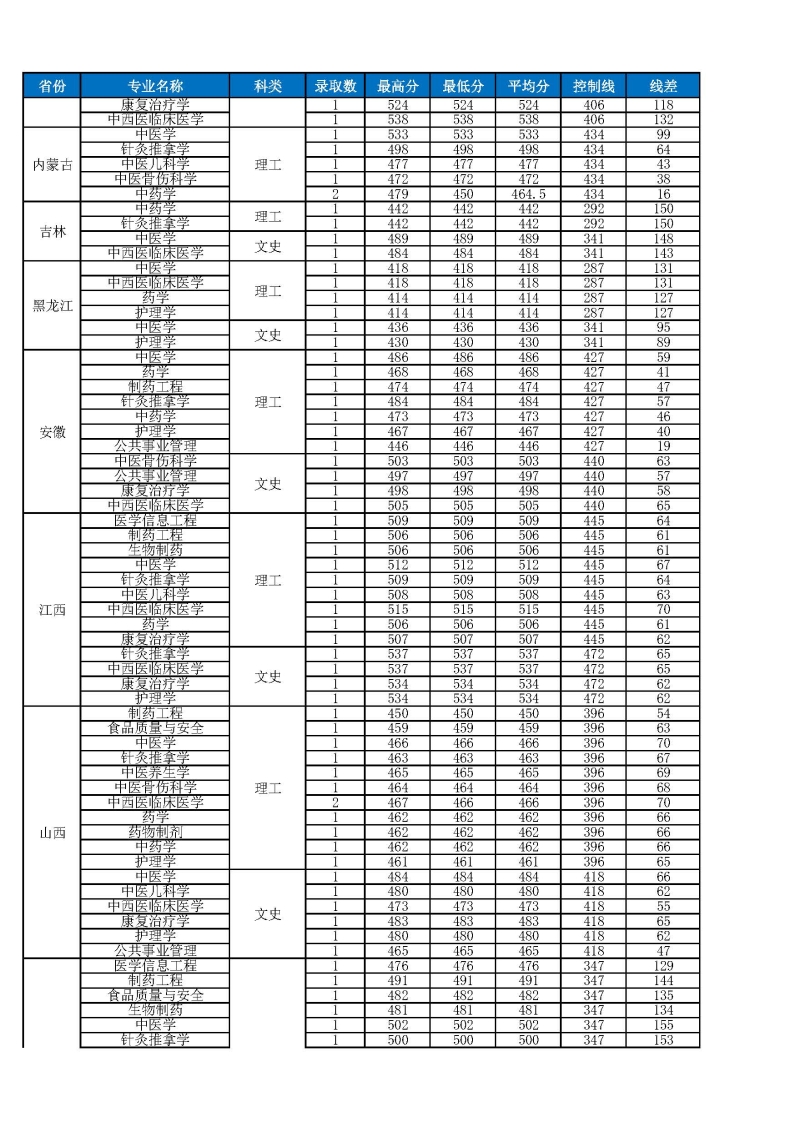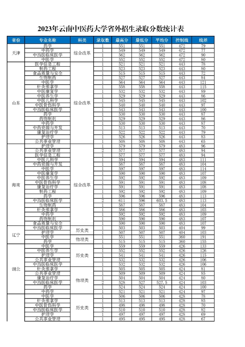 2023年云南中医药大学省外招生录取分数统计表