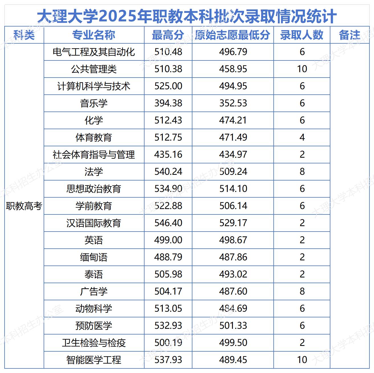 大理大学2025年职教本科批次录取情况统计