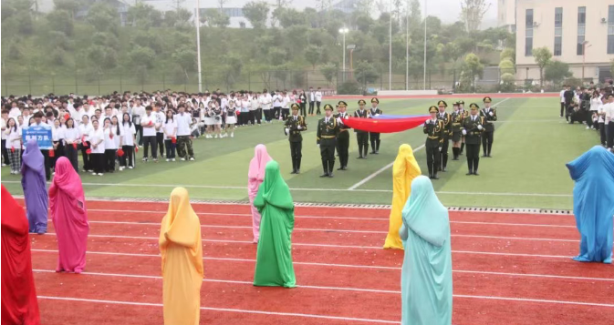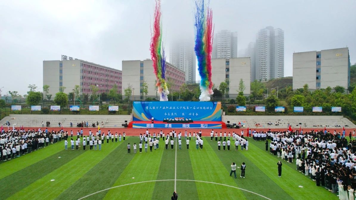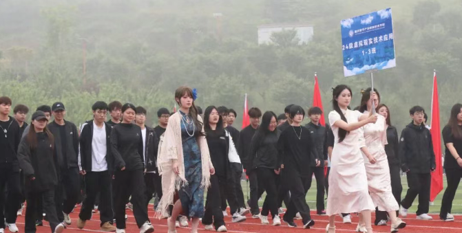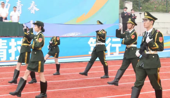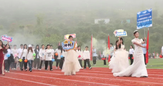 八点半整,随着激昂的运动员进行曲响起,国旗队、校旗队、彩旗队、裁判员方队、运动员代表队等20个方阵依次入场。他们步伐铿锵、口号嘹亮、整齐划一,充满创意的口号和节目展示,展现了重数师生昂扬向上、团结奋进的青春面貌。