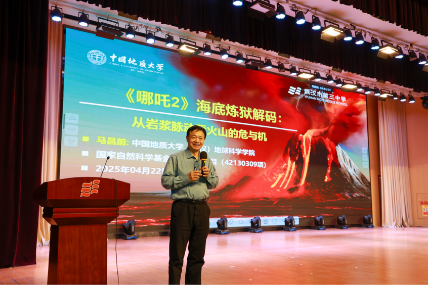 地球科学学院马昌前教授以《<哪吒2>海底炼狱解码:从岩浆脉动看火山的危与机》为主题开展科普讲座。他带领同学们从电影场景看现实中的火山,了解火山的成因和类型,以及火山活动对于人类发展进程的影响,与极端天气之间的密切联系,最后,他向同学们科普了火山喷发的危害和机遇,认识火山喷发的双面性,激发同学们探索地直奥秘的兴趣,鼓励同学们到中国地质大学(武汉)访问、参观、学习、深造!