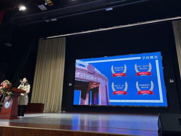 马睿老师以“青春作答,追光而行”为主题,向在场师生详细介绍了中国地质大学(武汉)的办学历史、学科特色、人才培养模式以及招生政策。他提到,地大作为教育部直属的“双一流”建设高校,始终秉承“艰苦朴素、求真务实”的校训精神。马睿老师特别强调了学校的培养特色,包括丰富的国际交流机会以及多元化的校园文化活动。他鼓励在场学生以青春为笔,勇敢追逐科学之光,从地大的“地质锤”到光谷的“量子芯”,共同书写未来的无限可能。生动的讲解辅以精彩的图片和视频展示,让在场师生对学校的校园环境、学术氛围和学生生活有了更加直观的认识。