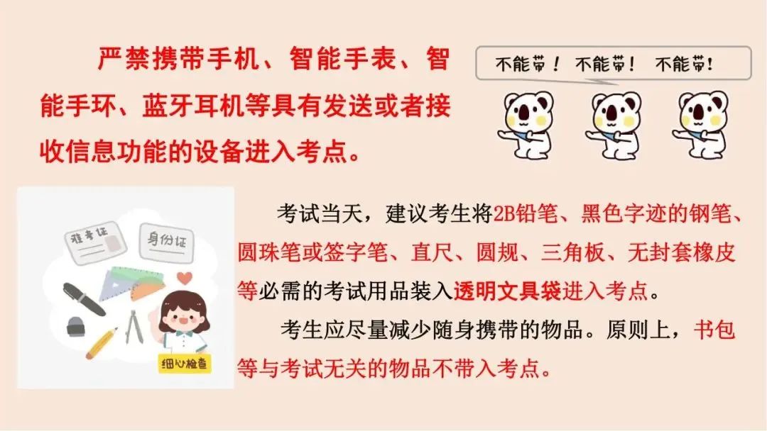 3.考试当日,建议考生将2B铅笔、黑色字迹的钢笔、圆珠笔或签字笔、直尺、圆规、三角板、无封套橡皮等必需的考试用品装入透明文具袋带入考点。原则上,书包等与考试无关的物品不带入考点。