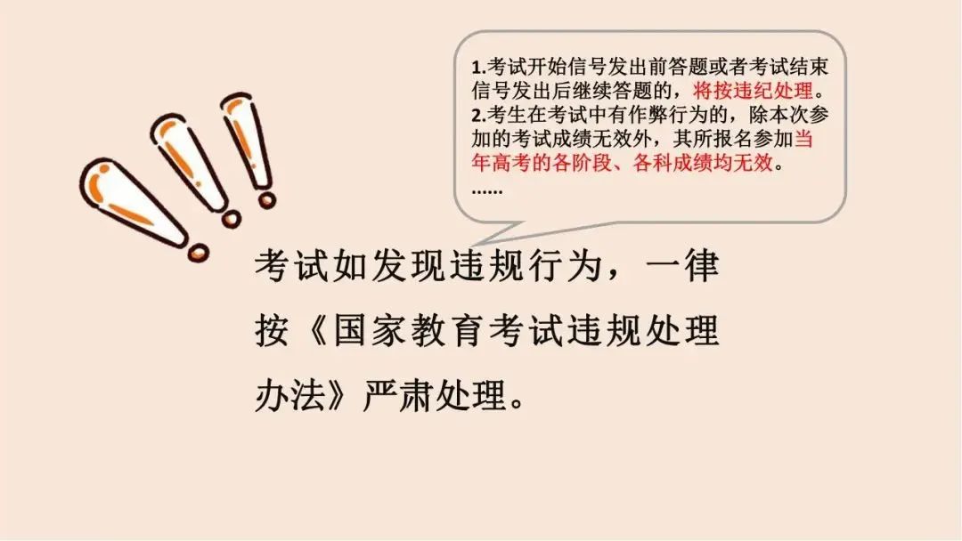 考生须自觉遵守考场规则,诚信考试。如有违规、违法行为将按《中华人民共和国教育法》《国家教育考试违规处理办法》《中华人民共和国刑法》《最高人民法院 最高人民检察院关于办理组织考试作弊等刑事案件适用法律若干问题的解释》严肃处理。