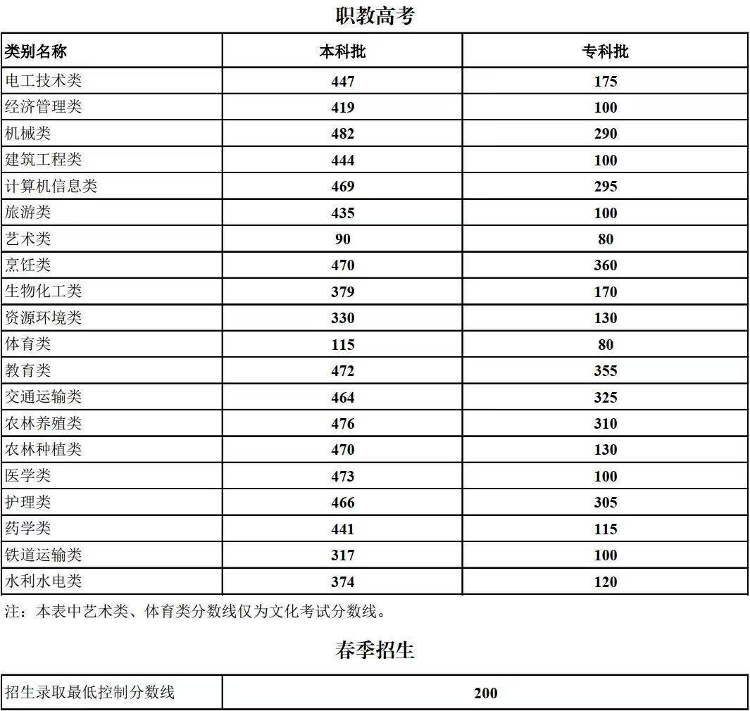 云南省2025年职教高考、春季招生录取最低控制分数线