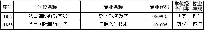 近日,教育部印发通知,公布2024年度普通高等学校本科专业备案和审批结果。陕西国际商贸学院获批普通本科专业2个,将于2025年开始招生!新增本科专业分别为:口腔医学技术、数字媒体技术。