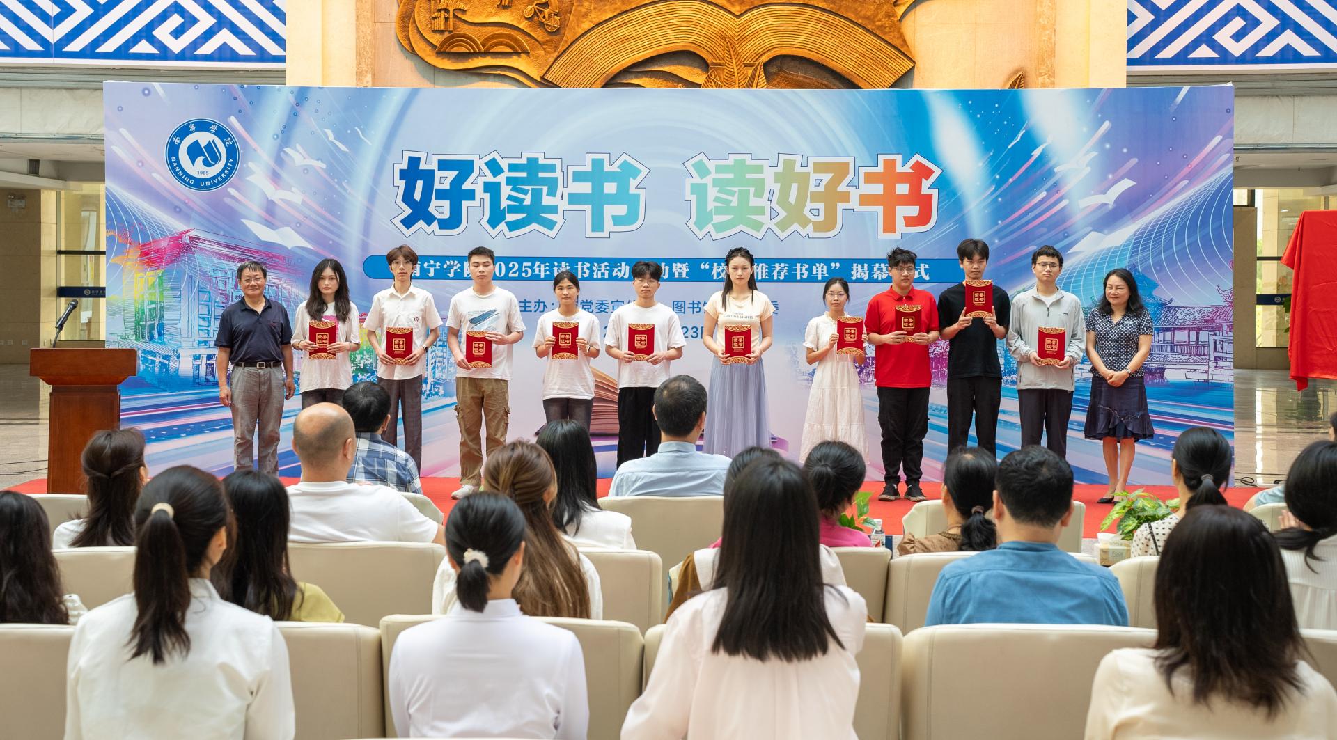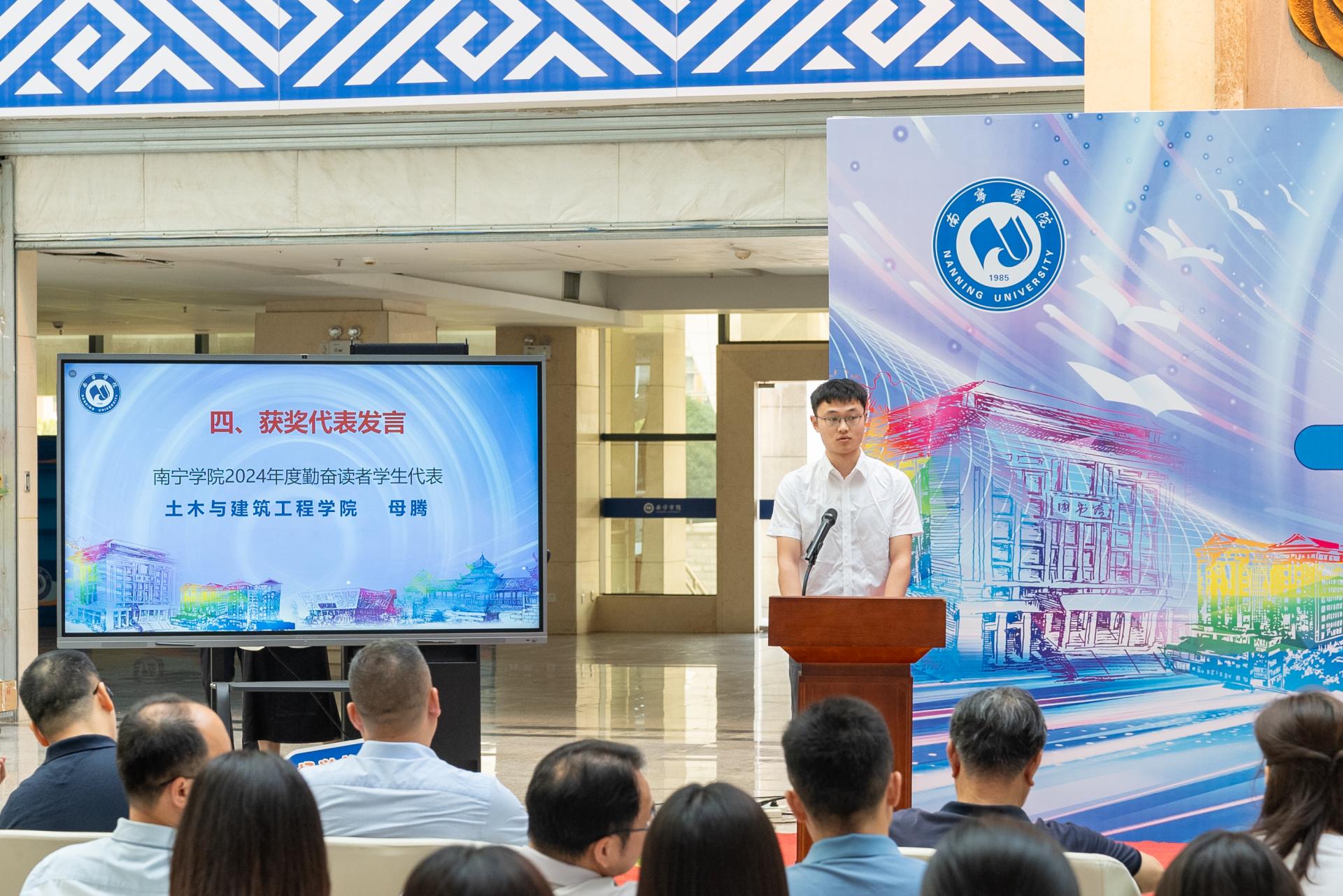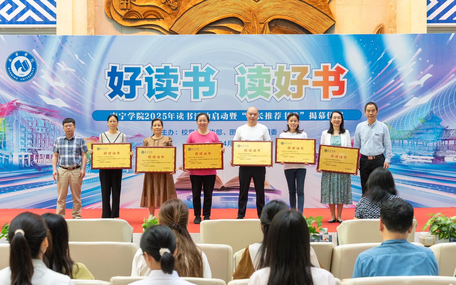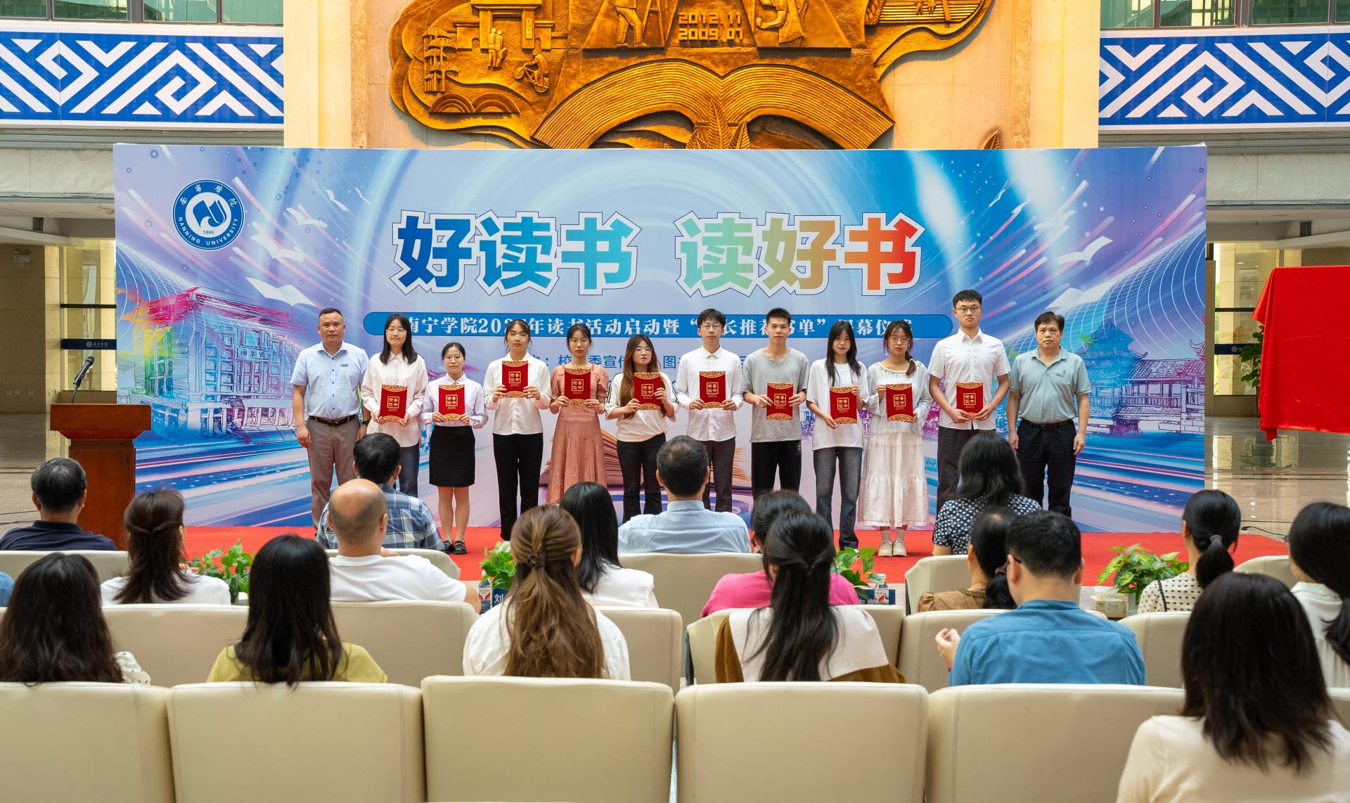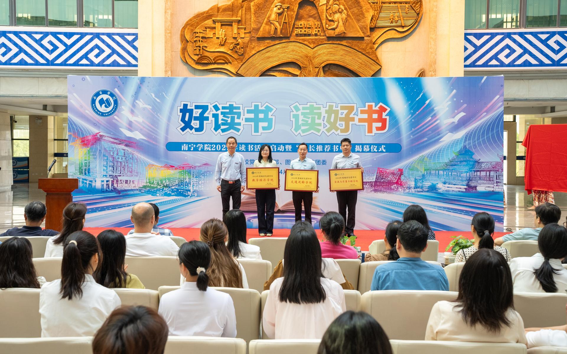 活动上对“南宁学院2024年度阅读先进单位”“南宁学院2024年度勤奋读者”进行表彰,向广西新华书店集团股份有限公司、上海新华传媒连锁有限公司、北京百万庄图书大厦有限公司、广东新华发行集团股份有限公司、广西海天图书发行有限责任公司、北京集文天下文化发展有限公司代表颁发捐赠证书。