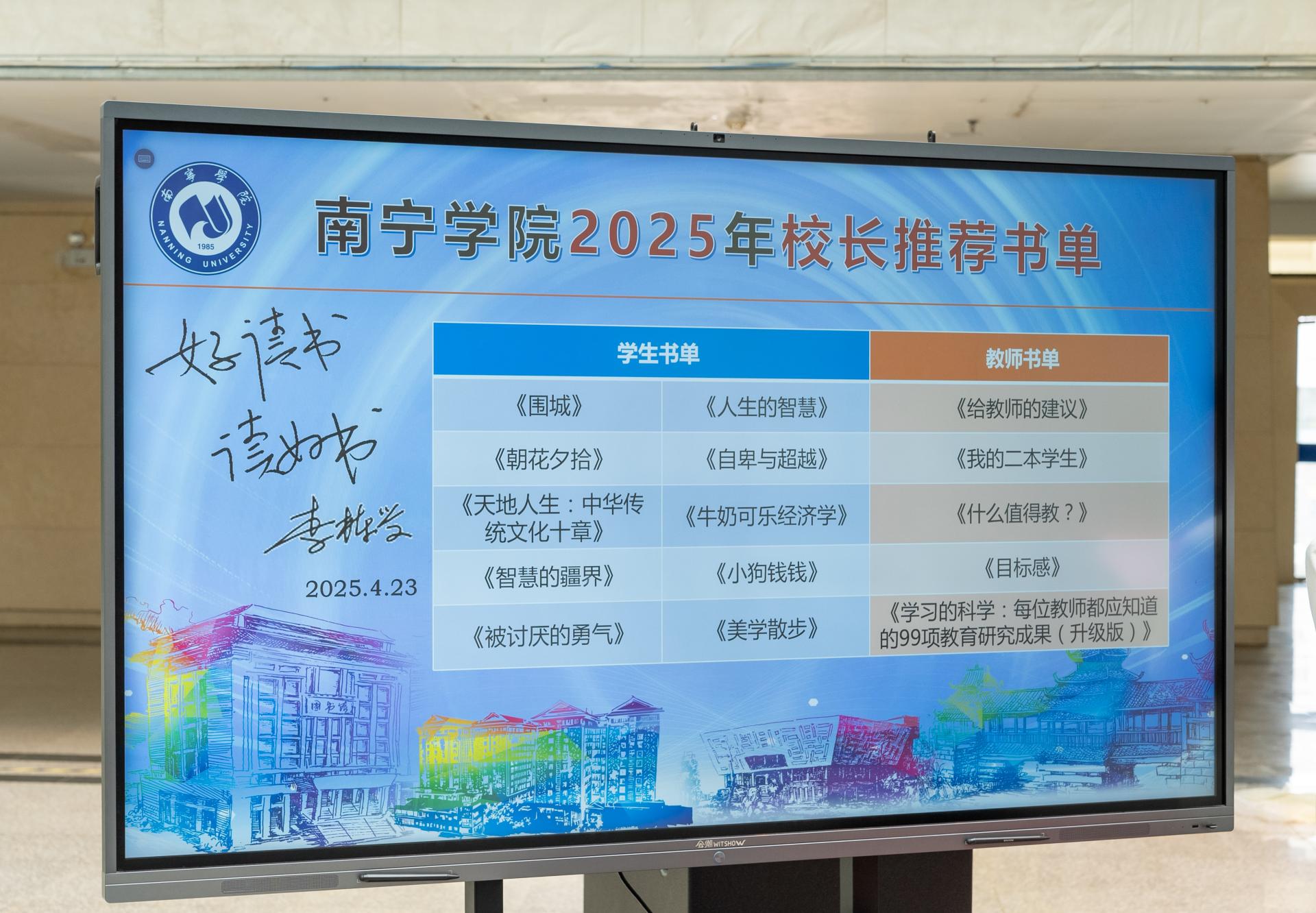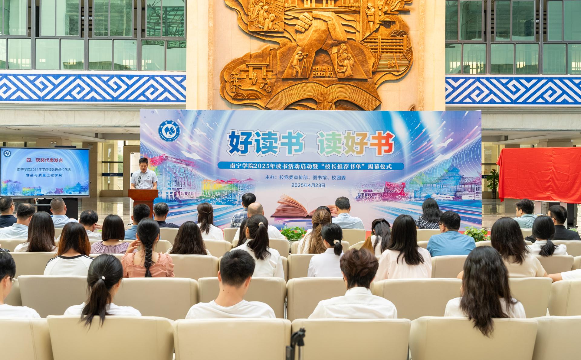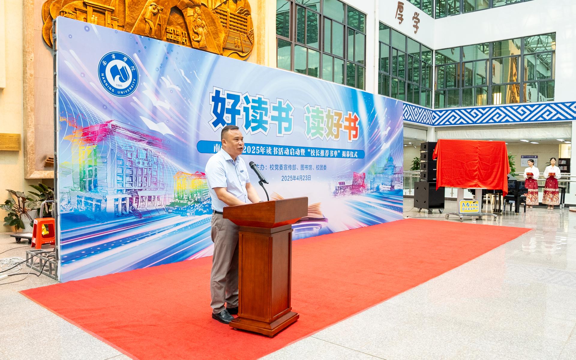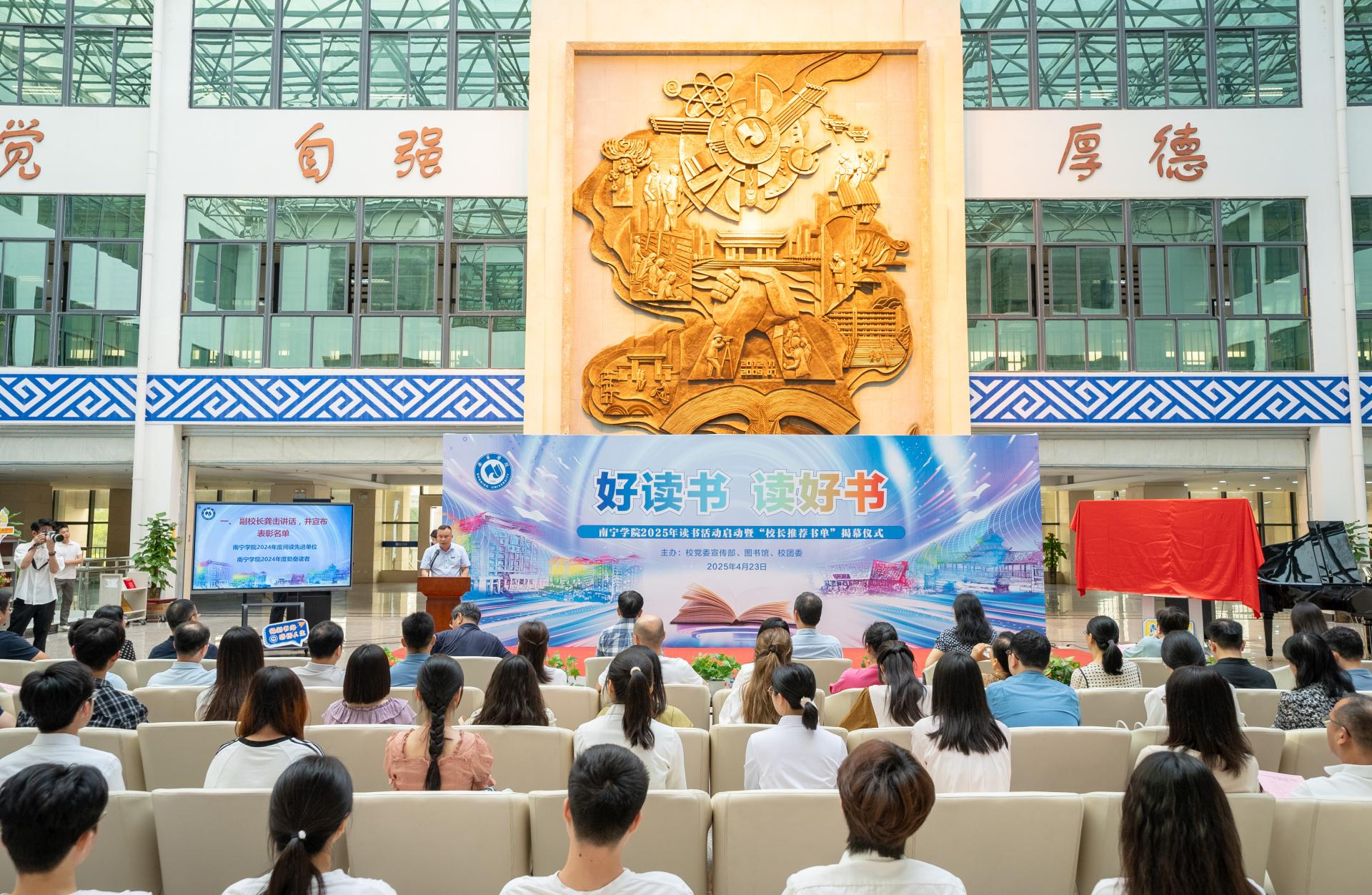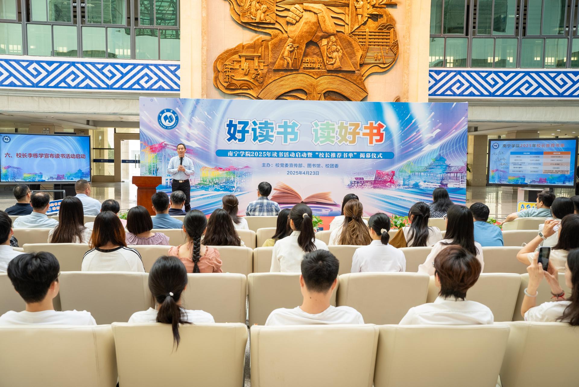为深入贯彻落实中央、自治区关于深化全民阅读活动的部署要求,全面推进学校阅读文化建设,在第三十个“世界读书日”,学校在图书馆中庭举行“好读书 读好书”2025年读书活动启动暨“校长推荐书单”揭幕仪式。全体校领导、图书捐赠企业代表及学校“勤奋读者”等师生代表共200余人参加开幕式。
