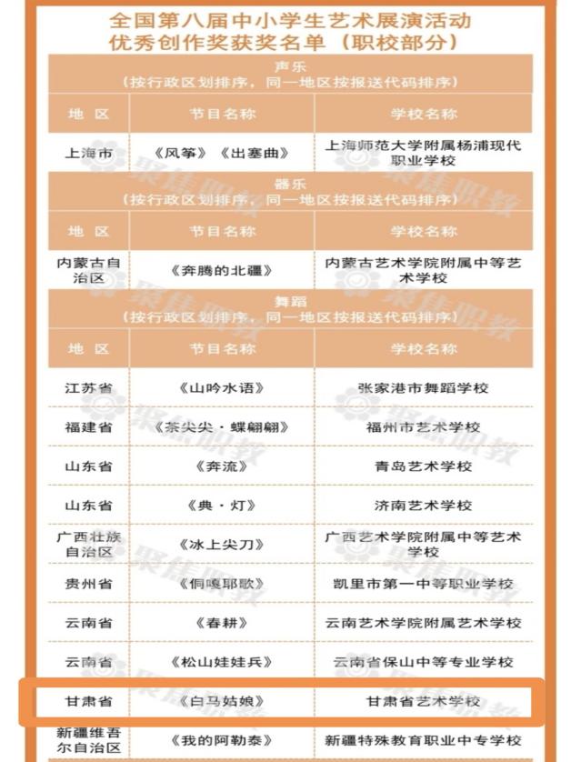 在教育部主办的全国第八届中小学生艺术展演活动评选中,我校艺术职业学院(甘肃省艺术学校)选送的舞蹈《白马姑娘》荣获舞蹈表演类一等奖(指导教师:李斌、张莉、颜昭洁)及优秀创作奖。4月25日,该作品代表甘肃省赴长沙参加了由教育部和长沙市人民政府共同主办的全国汇演活动。教育部党组成员、副部长、总督学王嘉毅出席开幕式并致辞,湖南省委常委、长沙市委书记吴桂英致欢迎辞。