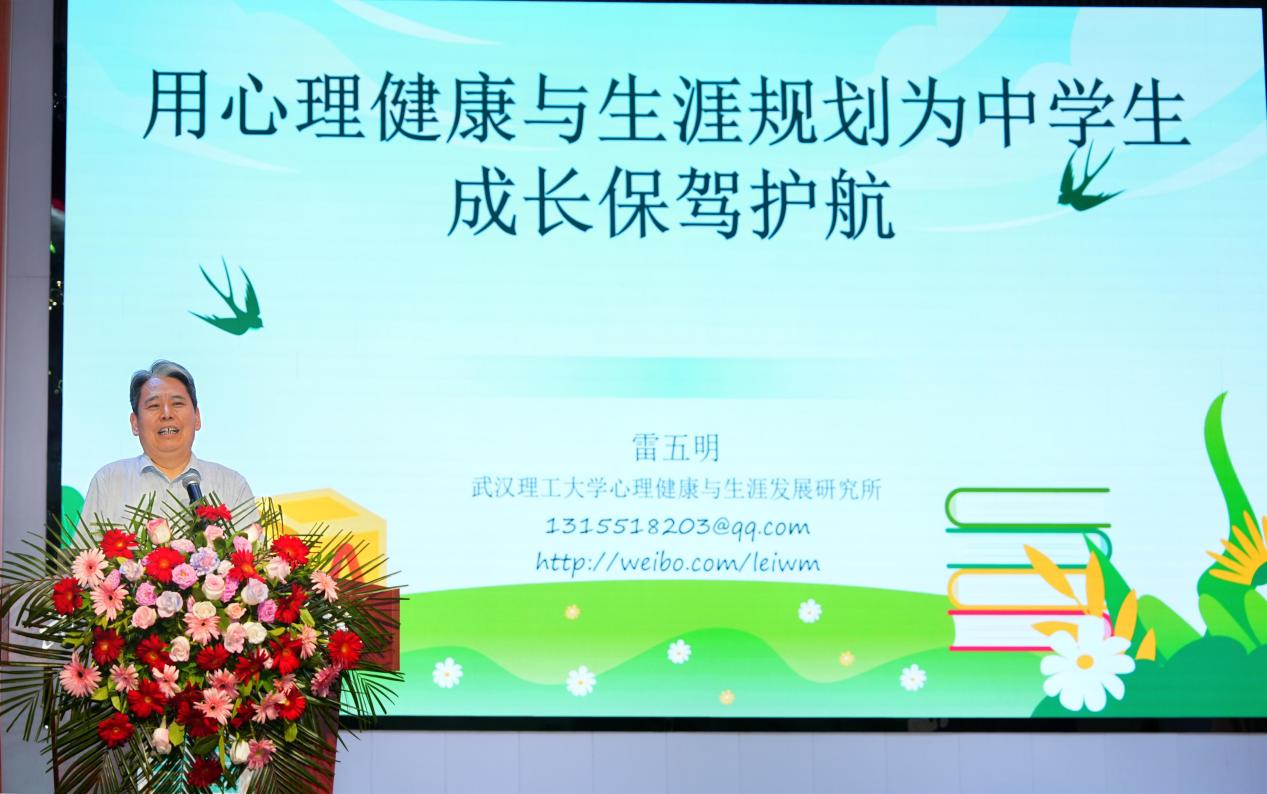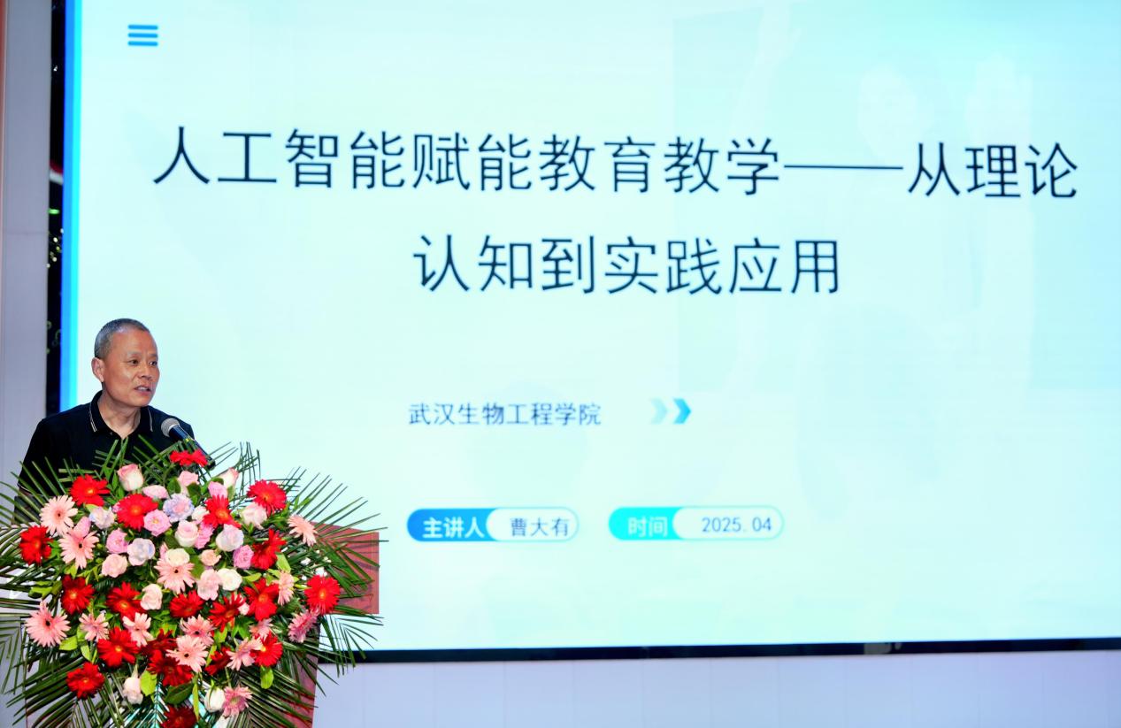 此次论坛特邀武汉理工大学雷五明教授和我校曹大有教授分别作专题报告。雷五明以《用心理健康与生涯规划为中学生成长保驾护航》为题,从中学生成长的现实需求出发,深入剖析了生涯教育与心理健康教育在学生成长过程中的重要性。雷五明结合丰富的案例,详细阐述了心理健康教育与生涯规划教育相辅相成的关系,强调学校、家庭和社会应形成合力,构建全方位的心理健康与生涯规划教育体系,为中学生成长提供坚实的保障。曹大有则围绕《人工智能赋能教育教学——从理论认知到实践应用》,探讨了人工智能技术在教育领域的应用前景。