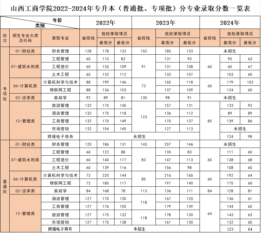 山西工商学院2022-2024年专升本(普通批、专项批)分专业录取分数一览表
