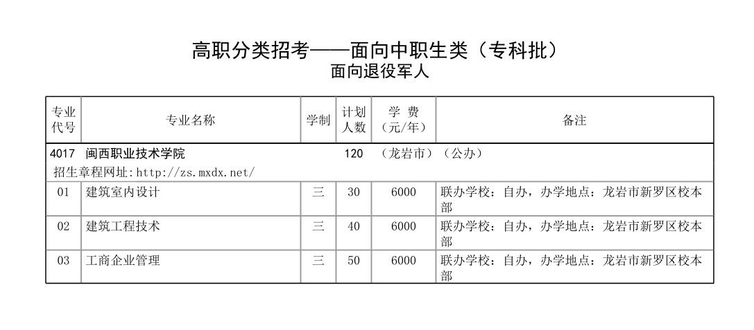 2021年闽西职业技术学院高职扩招招生计划(面向退役军人)