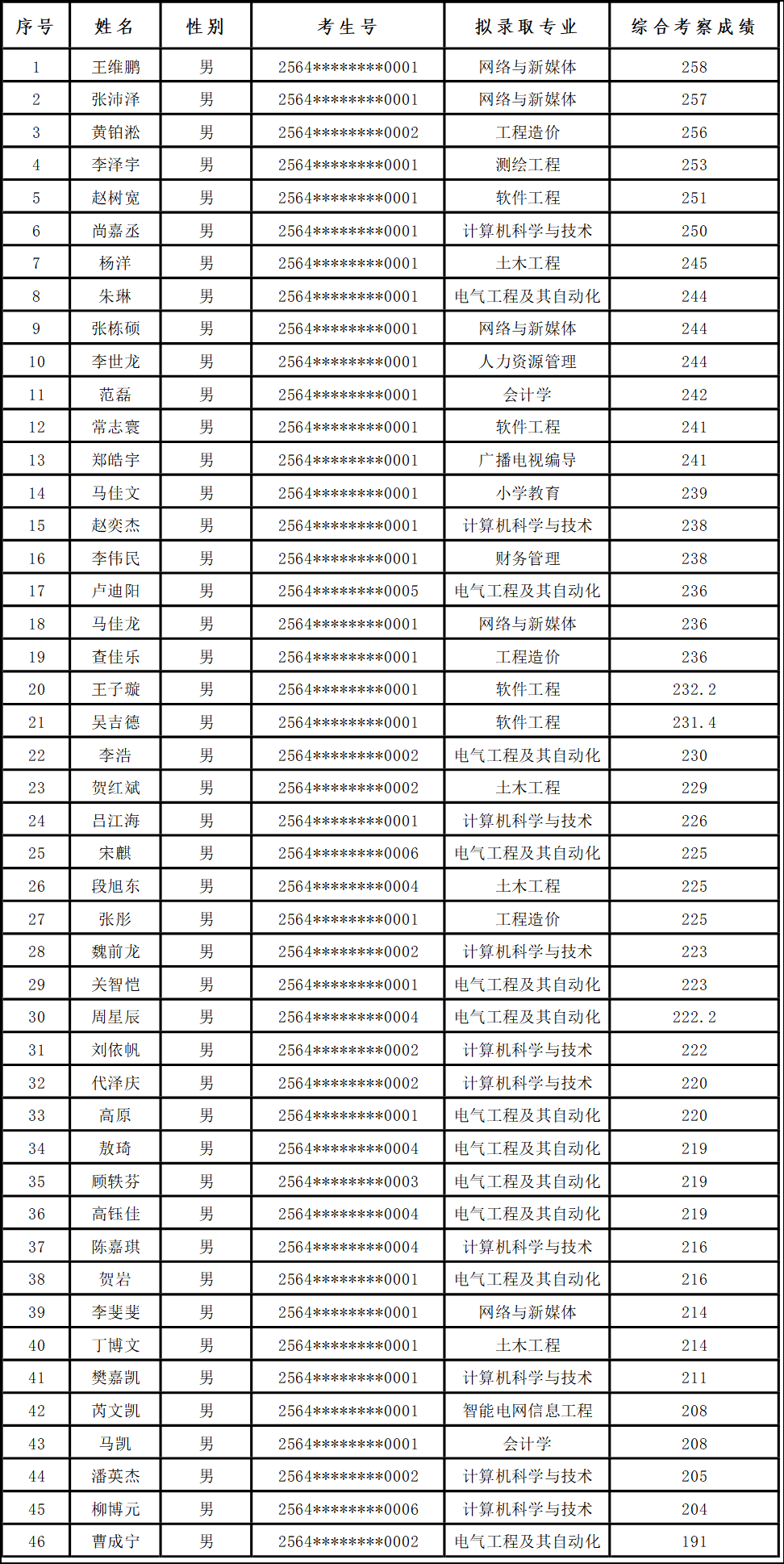 根据宁夏回族自治区教育厅、宁夏回族自治区退役军人事务厅及宁夏回族自治区人民政府征兵办公室《关于做好2022年退役大学生士兵免试普通高等教育专升本招生工作的通知》(宁教学〔2022〕34号),以及宁夏教育考试院《关于做好宁夏2025年普通高等教育高职(专科)升本科考试招生工作的通知》的相关要求,经考生申请、生源学校推荐、教育厅审核等环节,学校按照《银川科技学院关于开展2025年退役大学生士兵免试普通高等教育专升本综合能力考察面试的通知》相关内容,于2025年3月26日下午对符合免试录取条件的考生进行了现场面试综合考察。结合考生综合考察情况及成绩,经学校招生工作领导小组研究,确定学校最低录取资格线为190分,现对考核成绩合格的学生名单予以公示。