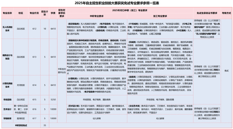2. 根据国家和省有关文件精神,模具设计与制造、计算机网络技术和市场营销专业免试条件为获得与报考专业相关的广东省中等职业学校技能大赛二等奖或全国职业院校大赛三等奖及以上奖项;艺术设计和学前教育专业免试条件为获得与报考专业相关的广东省中等职业学校技能大赛三等奖或全国职业院校大赛三等奖及以上奖项;无人机测绘技术专业免试条件为获得省级(含)以上行政部门主办的“无人机操控与维护”或“无人机应用技能与创新”职业技能大赛省级三等奖及以上奖项。