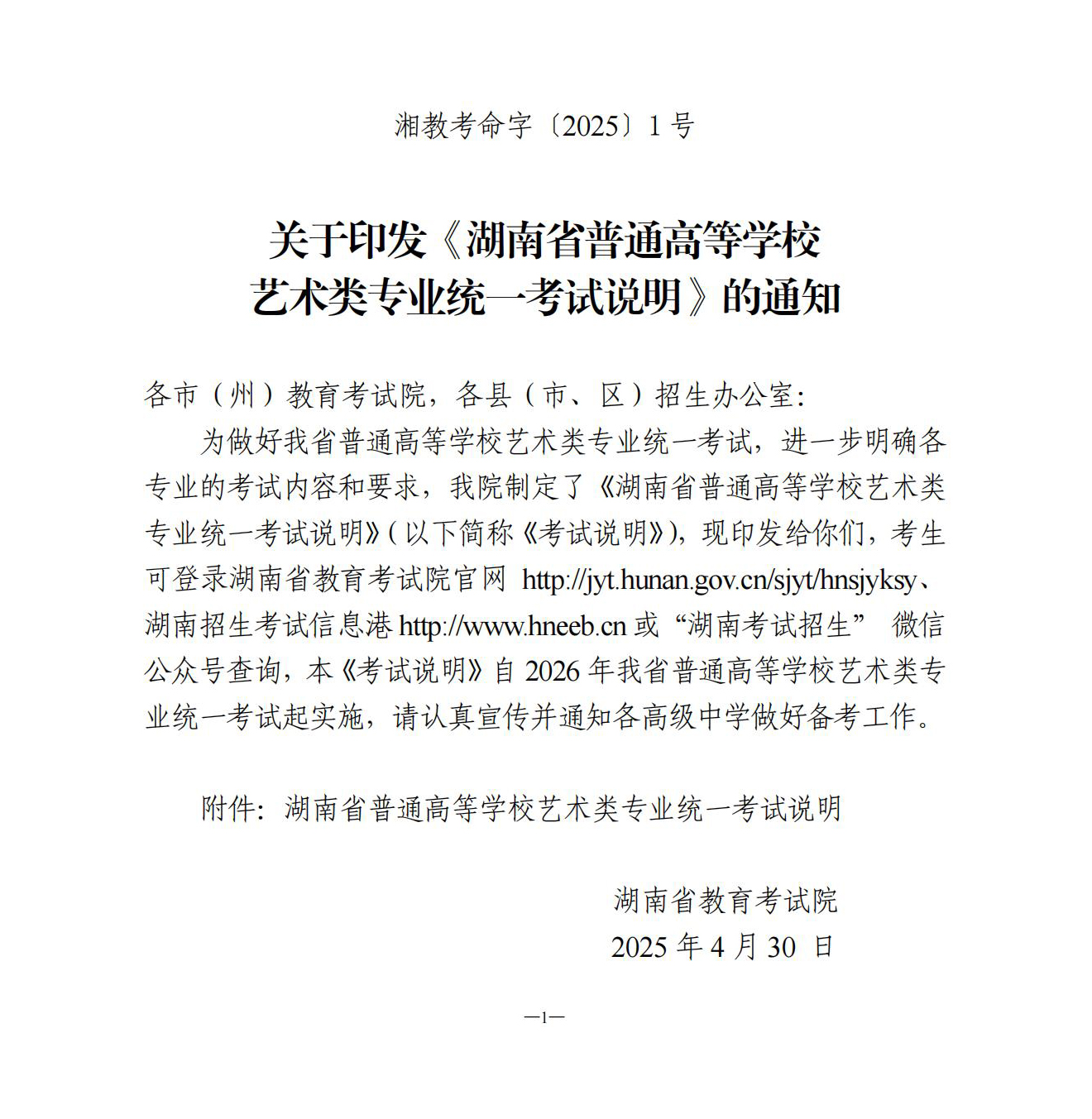 关于印发《湖南省普通高等学校艺术类专业统一考试说明》的通知