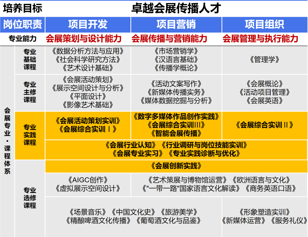 会展概论、传播学概论、智能会展传播、AIGC创作、会展活动策划、艺术策展与博物馆运营、活动项目管理、展示空间分析与设计、媒体数据挖掘与分析、新媒体传播实务、平面设计、数字多媒体作品创作实践、会展英语、活动文案写作等。